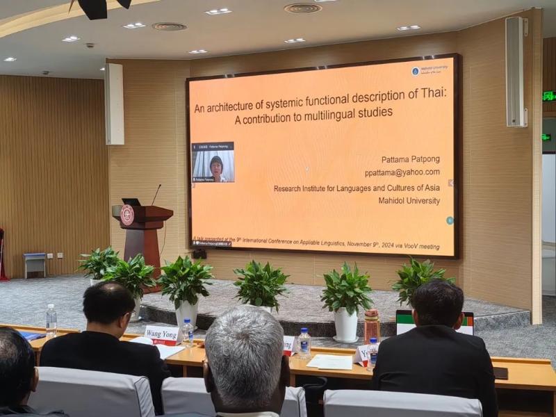 Dr. Pattama Patpong from Mahidol University in Thailand gave an online keynote speech titled "An Architecture of Systemic Functional Description of Thai: A Contribution to Multilingual Studies", chaired by Dr. Zhang Dongbing. Dr. Patpong introduced the construction of Thai language description from an SFL perspective, using the metaphor of building a house to illustrate the process of language description and emphasized the importance of corpus selection.