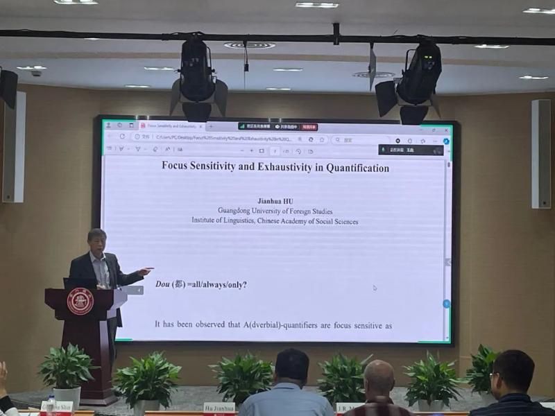 On the morning of November 10, Professor Hu Jianhua from Guangdong University of Foreign Studies / Chinese Academy of Social Sciences delivered a plenary speech titled "Focus Sensitivity and Exhaustivity in Quantification", chaired by Dr. Wang Pin. Professor Hu explored the meaning of the Chinese quantifier "du" (都) through a range of examples, providing a detailed analysis and comparison, and highlighted the differences in focus sensitivity and exhaustivity between Chinese and English quantifiers.