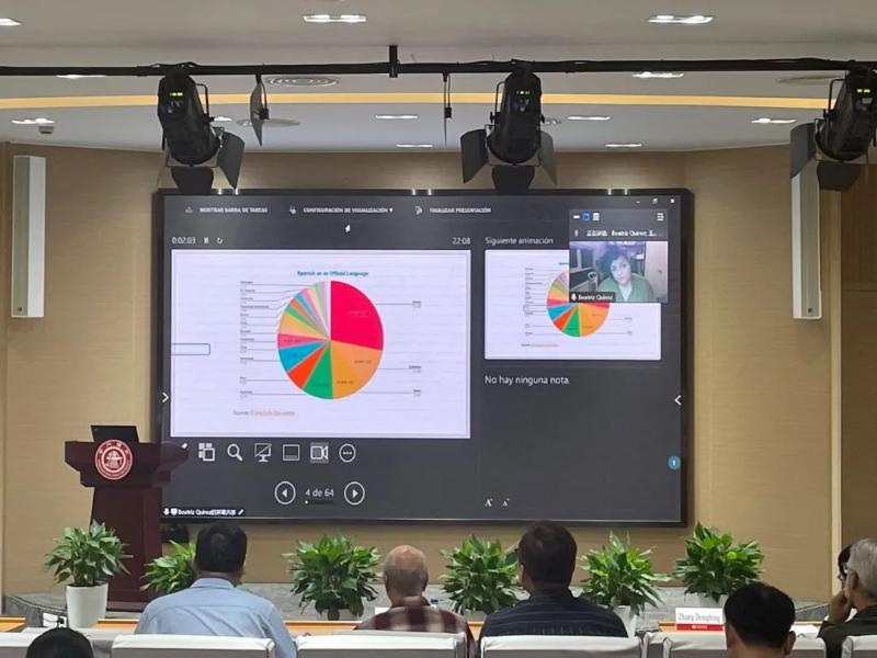 Dr. Beatriz Quiroz from the Catholic University of Chile gave an online keynote speech titled "The Search for Structural Patterns in SFL Language Description: Drawing on Available Accounts in Relation to Nominal DEIXIS in Spanish", chaired by Dr. Wang Pin. Dr. Quiroz discussed the application of Systemic Functional Linguistics to describe nominal deixis in Spanish, analyzing existing descriptions and emphasizing the importance of exploring expressive patterns in structural functions.